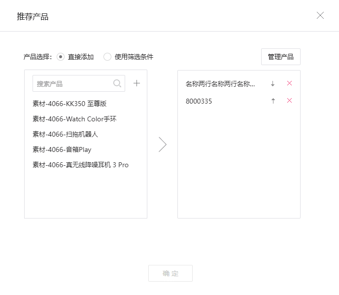 2. 设置推荐产品弹窗中,提供“直接添加”、“使用筛选条件”两种方式关联推荐产品,点击右上角关闭按钮关闭弹窗。