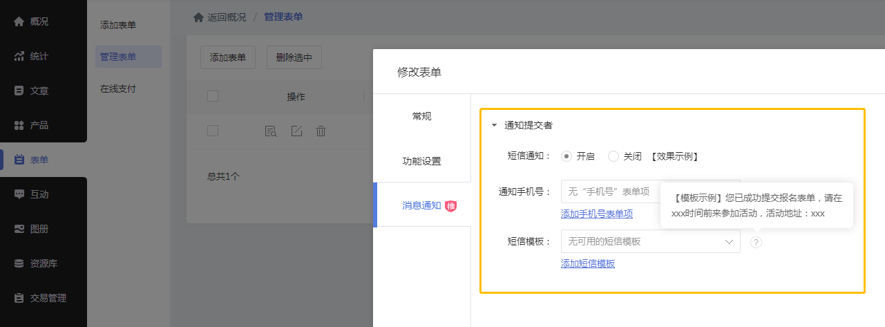 ③ 等待审核完成后,到您需要应用短信的入口开启短信通知,选择对应的发送场景短信。