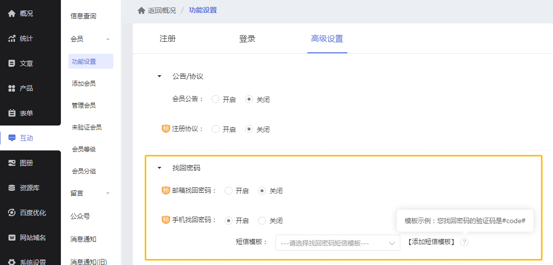 消息通知(留言板、会员注册) 这里直接开启即可,无需申请模板 | ![]() | |