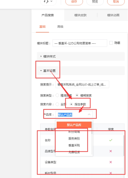 搜索内容设置选择【指定参数】时,可以对不同产品库分别设置产品库内的哪些参数允许作为搜索内容,并不是说这个模块只搜索该产品库。