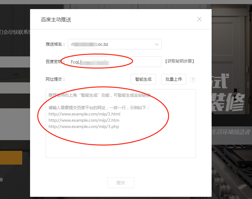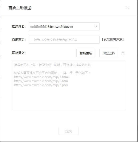 对已绑定的推送域名推送网址,填写百度秘钥后,可批量推送网址,网址生成方式包括:手动输入、智能生成、批量上传