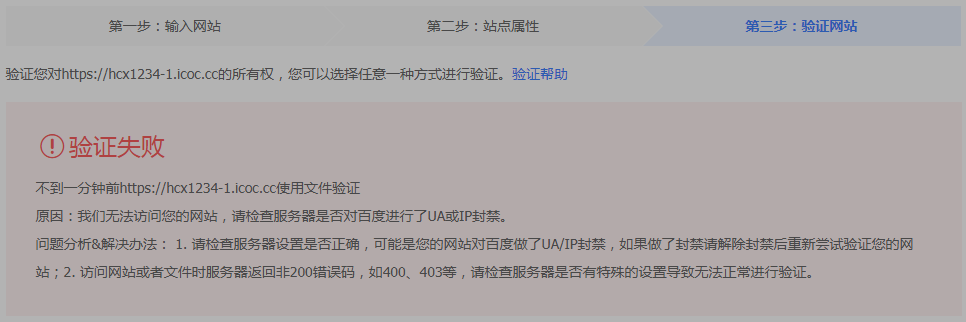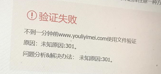 Q:操作百度主动推送验证时,出现错误提示“未知原因:301”,怎么办?